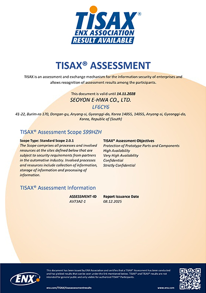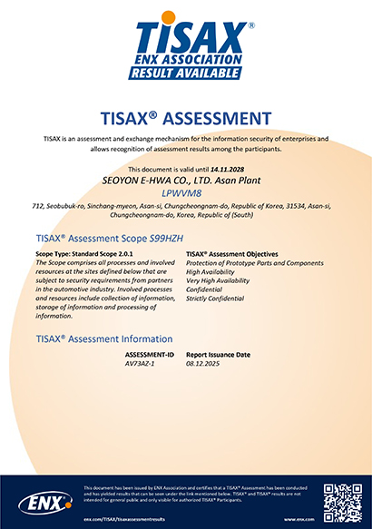 | 13 | TISAX | TISAX | 서연이화 | LF6CY6 | - | 2025-12-08 | 2028-11-14 | ENX |